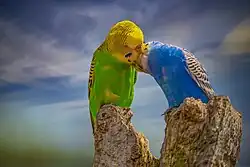 Psitacídeos como papagaios e periquitos realizam alimentação de cortejo (aloalimentação), com a transferência de comida pelo entrelaçamento dos bicos assemelhando-se a um beijo: é um ritual de fortalecimento do vínculo de par (bonding).[36] Esse comportamento (também chamado "billing" em inglês) também é visto em outras aves, como pombos, pode ocorrer sem alimentação[37] e visa à manutenção de relacionamento monogâmico para além da finalidade de acasalamento.[38][39]