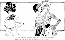 Uma caricatura de 1900 de Jan Duch da revista Le Frou Frou satirizando uma tendência do estilo parisiense que favorece os seios pequenos ("Será ridícula esta mulher com seus seios enormes?" "Parece que ainda está em alta nas províncias.")[8]