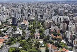 Projetada pelo engenheiro Aarão Reis entre 1894 e 1897, Belo Horizonte foi uma das primeiras cidades brasileiras planejadas (algumas fontes a citam como primeira;[50][51] outras como terceira, após Teresina e Aracaju[52][53] e até a quarta, sendo Petrópolis a primeira[54]). Elementos chaves do seu traçado incluem uma malha perpendicular de ruas cortadas por avenidas em diagonal, quarteirões de dimensões regulares e uma avenida em torno de seu perímetro, a Avenida do Contorno.[50][51] Trecho do relatório escrito por Aarão Reis, engenheiro-chefe da Comissão Construtora da Nova Capital, sobre a planta definitiva de Belo Horizonte, aprovada pelo Decreto nº 817 de 15 de abril de 1895:
