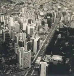 Na década de 1950, a população da cidade dobrou novamente, passando de 350 mil para 700 mil habitantes. Como resposta ao crescimento desordenado, o prefeito Américo René Gianetti deu início à elaboração de um Plano Diretor para Belo Horizonte.[57] Na década de 1960, muitas demolições foram feitas, transformando o perfil da cidade, que passou, então, a ter arranha-céus e asfalto no lugar de árvores. Belo Horizonte ganhou ares de metrópole. A conurbação da cidade com municípios vizinhos se ampliou. Ainda neste período, a cidade atingiu mais de um milhão de habitantes. Nessa época, os espaços vazios do município praticamente se esgotaram e o crescimento populacional passou a se concentrar nos municípios conurbados a Belo Horizonte, como Sabará, Ibirité, Contagem, Betim, Ribeirão das Neves e Santa Luzia. Na tentativa de resolver os problemas causados pelo crescimento desordenado, foi instituída a Região Metropolitana de Belo Horizonte e foi criado o Plambel, que desencadeou diversas ações visando a conter o caos metropolitano.[58]