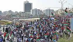 Foi em Bengasi que em fevereiro de 2011 começaram os protestos contra Gadafi que rapidamente dariam origem à guerra civil que culminaria na deposição e morte do ditador líbio no poder desde 1969. Durante os protestos foram mortas pelas forças de Gadafi mais de 500 pessoas em Bengasi.[17] No final de fevereiro de 2011 o governo perdeu o controlo da cidade para o Conselho Nacional de Transição, que lá instalou a sua sede.[7]