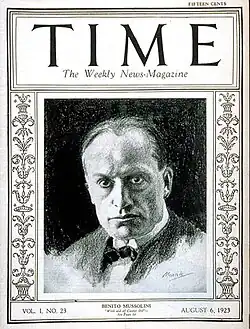 Mussolini foi o fundador do fascismo,[4] que incluía elementos de nacionalismo, corporativismo, capitalismo monopolista,[5] sindicalismo nacional, expansionismo, progresso social, colaboração de classes,[6] antiliberalismo, anticomunismo e oposição ao capitalismo liberal,[6] se opondo também às ideias de luta de classes e do materialismo histórico,[7] utilizando-se da censura de subversivos e maciça propaganda do Estado e culto à personalidade em volta do líder.[8] Nos anos seguintes à criação da ideologia fascista, Mussolini conquistou a admiração de uma grande variedade de figuras políticas.[9]