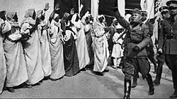 Em Forlì, Mussolini conheceu Pietro Nenni, então secretário da nova Câmara do Trabalho Republicana, nascida após a divisão entre republicanos e socialistas. No início os dois, apesar de vizinhos, eram adversários, depois tornaram-se amigos. Em setembro de 1911, junto com Pietro Nenni, participou de uma manifestação, liderada pelos socialistas, contra a Guerra Ítalo-Turca na Líbia. Ele amargamente denunciou a estratégia, que classificou como "guerra imperialista", da Itália de capturar a capital da Líbia, Tripoli, uma ação que lhe valeu um período de cinco meses na prisão.[55] Naquela época, propondo o internacionalismo proletário, Mussolini declarava: “A bandeira nacional é para nós um pano para plantar em um monturo”.[56]