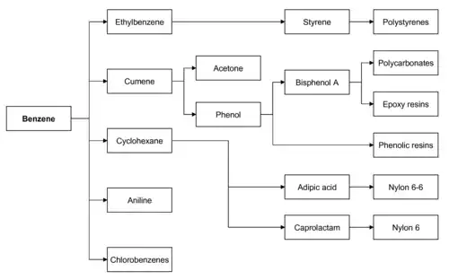 Tanto na Europa quanto nos EUA, 50% do benzeno é usado na produção de etilbenzeno/estireno, 25% é usado na produção de cumeno, e aproximadamente 15% de benzeno é usado na produção de ciclohexano (eventualmente para nylon).