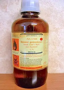 Também é conhecido por ser carcinogênico. É uma substância usada como solvente (de iodo, enxofre, graxas, ceras, etc.) e matéria-prima básica na produção de muitos compostos orgânicos importantes como fenol, anilina, trinitrotolueno, plásticos, gasolina, borracha sintética e tintas. A benzina é uma mistura de hidrocarbonetos obtida principalmente da destilação do petróleo que possui faixa de ebulição próxima ao benzeno.