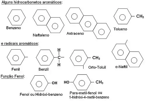 - Hidrocarbonetos aromáticos - são aqueles hidrocarbonetos que geralmente possuem um ou mais benzenos (ver ressonância nesta página).