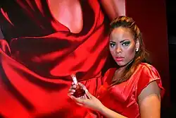 Uma mulher morena é dançar e detém um microfone com a mão. Ela veste roupas escuras enquanto segura as mãos na frente do peito.