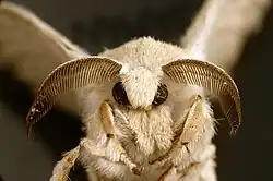 As antenas são grandes e claramente visíveis, elas têm uma cor marrom escura. As antenas de fêmeas e machos têm aproximadamente a mesma forma; as dos machos, no entanto, tornam-se maiores. Elas são altamente ramificadas, sua parte inferior carrega uma fileira de longos apêndices.[13] Os anexos da antena do meio são mais longos, fazendo com que pareçam uma mola. Os olhos são redondos e de cor preta, que os faz sobressair entre os pelos claros do corpo. Os olhos têm uma função sensorial subordinada. Para orientar-se, a mariposa usa principalmente as antenas.[14]