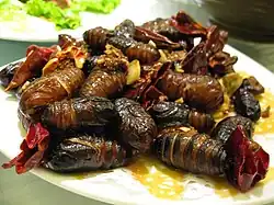 As pupas do bicho-da-seda são comidas em algumas culturas: em Assam, eles são cozidos para extração de seda e as pupas cozidas são comidas diretamente com sal, fritas com pimenta ou ervas como um lanche;[50] na Coreia, eles são cozidos e temperados para fazer um lanche popular conhecido como beondegi (번데기); na China, vendedores ambulantes vendem pupas de bicho-da-seda assadas; no Japão, eles são geralmente servidos como tsukudani (佃煮), ou seja, cozidos em molho agridoce feito com molho de soja e açúcar; no Vietnã, isso é conhecido como con nhộng. Os bichos-da-seda também foram propostos para o cultivo pelos astronautas como alimento espacial em missões de longo prazo.[51]