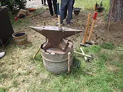 Não havendo possibilidade de aquisição comercial de uma bigorna, um substituto viável seria um trilho ferroviário de aproximadamente quarenta centímetros de comprimento, firmemente afixado em um robusto bloco de madeira.[19]