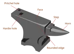 O bloco maciço tem parte superior temperada chamada "face",[16] extremamente dura e resistente, de modo a preservar a forma e a integridade da superfície com o uso. Esta parte é geralmente plana, mas existem bigornas com topo curvo utilizadas em aplicações específicas.[2]