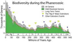 A biodiversidade cresceu rapidamente durante o Fanerozóico (os últimos 540 milhões de anos), especialmente durante a chamada explosão Cambriana — um período durante o qual quase todos os filos de organismos multicelulares apareceram pela primeira vez.[102] No entanto, estudos recentes sugerem que esta diversificação começou antes, pelo menos no Ediacarano, e que continuou no Ordoviciano.[103] Nos próximos 400 milhões de anos ou mais, a diversidade de invertebrados mostrou pouca tendência geral e a diversidade de vertebrados mostra uma tendência exponencial geral.[13] Este aumento dramático na diversidade foi marcado por perdas periódicas e massivas de diversidade, classificadas como eventos de extinção em massa.[13] Uma perda significativa ocorreu em vertebrados com membros anamnióticos quando as florestas tropicais entraram em colapso no Carbonífero,[104] mas os amniotas parecem ter sido pouco afetados por este evento; sua diversificação desacelerou mais tarde, em torno da fronteira Asseliana/Sakmariana, no início do Cisuraliano (início do Permiano), cerca de 293 milhões de anos atrás.[105] O pior foi o evento de extinção do Permiano-Triássico, 251 milhões de anos atrás.[106][107] Os vertebrados levaram 30 milhões de anos para se recuperar deste evento.[108]