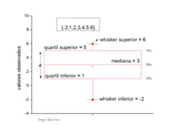 Diagrama de caixa é um método para representar graficamente grupos de dados numéricos. Os valores máximo e mínimo são representados pelas linhas e a caixa representa a mediana e o intervalo interquartil representa 25–75% dos dados. Dados extrapolantes (Outliers) podem ser plotados como círculos.