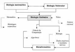 Na verdade como muitos destacam, um definição direta e simples não é possível, principalmente devido ao fato de que o campo tem mudado com a evolução de paradigmas, o que é claro são as raizes desta que são, usando como referência: biologia matemática (mathematical biology), biologia molecular (Molecular Biology), matemática, física, ciência da computação, engenharia, e outras; ver esquema ao lado.