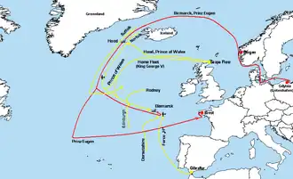 Às 4h00min de 23 de maio, Lütjens ordenou que o Bismarck e o Prinz Eugen aumentassem a velocidade para 27 nós (cinquenta quilômetros por hora) e entrassem no Estreito da Dinamarca[40] e ativassem seus radares FuMO.[41] O Bismarck e o Prinz Eugen mantiveram uma distância de setecentos metros entre si; a neblina reduziu a visibilidade em quatro quilômetros. Os alemães encontraram gelo por volta dás dez horas, o que forçou a redução da velocidade para 24 nós (44 quilômetros por hora). Duas horas depois eles chegaram ao norte da Islândia. As embarcações fizeram zigue-zague para evitar banquisas. Às 19h22, os hidrofones e radares alemães detectaram o cruzador HMS Suffolk à aproximadamente 12 500 metros.[40] A equipe de interceptação de rádio do Prinz Eugen decodificou transmissões do Suffolk, descobrindo que suas posições haviam sido descobertas pelos britânicos.[42]