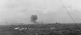 Apesar do Bismarck ter sido danificado na batalha e forçado a reduzir a velocidade, ele ainda era capaz de alcançar 28 nós (52 quilômetros por hora), a mesma velocidade máxima do HMS King George V de Tovey. A menos que o Bismarck fosse retardado, os britânicos não conseguiriam impedir sua chegada a Saint-Nazaire. Pouco depois dàs 22h00 do dia 25 de maio, Tovey enviou o porta-aviões HMS Victorious e quatro cruzadores rápidos para criarem um curso que permitiria ataques com aviões torpedeiros. Às 22h, o Victorious lançou um ataque composto por seis Fairey Fulmar e nove Fairey Swordfish. Os aviadores inexperientes quase atacaram o Norfolk na sua aproximação e a confusão alertou os atiradores antiaéreos do Bismarck.[74] O navio alemão disparou suas baterias principais e secundárias com depressão mínima afim de criar enormes colunas d'água no caminho das aeronaves.[75] Mesmo assim, nenhum torpedeiro foi abatido. O Bismarck desviou de oito torpedos de um total de nove lançados.[74] O nono acertou à meia-nau no cinturão principal de blindagem e causou danos pequenos. O impacto jogou um homem contra uma parede, matando-o; outros cinco foram feridos.[76]