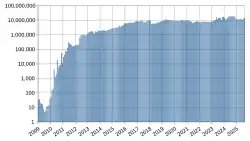 O artigo descrevendo o funcionamento do bitcoin foi publicado em 2008 por Satoshi Nakamoto,[21] pseudônimo de um programador ou grupo de programadores anônimo(s).[22] Uma versão inicial do software foi lançada em 2009.[23] Até 2012, a moeda era usada principalmente em mercados negros virtuais, tais quais o Silk Road.[24] Desde 2013, o uso e a cotação da moeda perante o dólar tem aumentado significativamente,[25] com o valor máximo histórico sendo registrado a 6 de outubro de 2025, ultrapassando 126 000 dólares por bitcoin.[26] A cotação tem sofrido alta instabilidade, devido, entre outros fatores, a ataques contra bolsas de câmbio virtuais.[27] De dezembro de 2017 a fevereiro de 2018, o valor do bitcoin caiu 70%, por exemplo.[28]