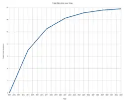 Inflação6.25 bitcoins por bloco (aproximadamente a cada dez minutos) até 19 de abril de 2024,[6] e então posteriormente 3.125 bitcoins por bloco por 4 anos até a próxima redução pela metade. O processo continua até 2110–2140, quando 21 milhões de bitcoins terão sido criados.