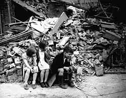 Crianças no East End de Londres, desabrigadas pelas bombas dos ataques Nazi, aguardam ao lado da pilha de escombros do que fora sua casa. Setembro de 1940 (National Archives)
