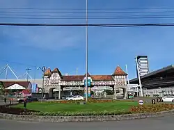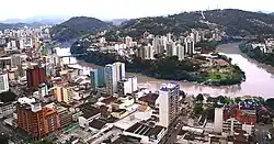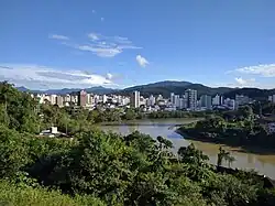 Panorama urbano de Blumenau Cidade com o rio Itajaí-Açu Parque Vila Germânica Catedral São Paulo Apóstolo Prefeitura de Blumenau Teatro Carlos Gomes Castelinho da Moellmann | |