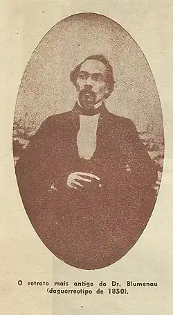 A história de Blumenau é resultado da vinda de imigrantes alemães que se estabeleceram em terras de fertilidade da Mata Atlântica e construíram a colônia São Paulo de Blumenau.[14] Foi fundada pelo químico farmacêutico Dr. Hermann Blumenau, de quem a cidade recebeu o nome.[14] Tendo interesse pelos problemas enfrentados pelos imigrantes europeus, em 1845 se entendeu com a Sociedade de Proteção aos Emigrados Alemães para representá-la via procuração e rumou ao Brasil, objetivando instalar novas colônias e, ao mesmo tempo, fazer a verificação da situação das que já existiam. Deslocou-se pelo Rio Grande do Sul, e em seguida, em Santa Catarina, onde fez uma visitação à colônia alemã de São Pedro de Alcântara. Ciente de comentários a respeito do vale do Itajaí, explorou-o detalhadamente, associando ao seu compatriota Ferdinand Hackradt, já que a sociedade acima mencionada se dissolveu.[14]