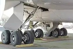 Pormenor de um trem de aterragem de 16 rodas de um 747.
