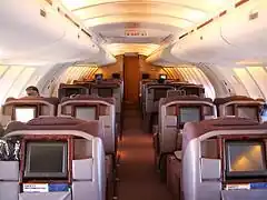 Classe económica de um 747-400, com as cadeiras dispostas num esquema 3-4-3.