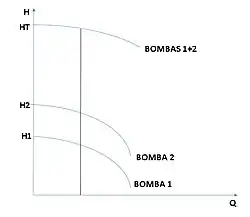 As curvas do sistema podem se tornar mais achatadas, ou mais inclinadas. Outra possibilidade de associação de bombas é em paralelo, e isso ocorre quando a vazão exigida pelo sistema é maior que a proporcionada pela bomba. Essa associação garante uma segurança operacional, pois em caso de falha de uma bomba, as outras operam normalmente, o que não ocorrerá em sistemas em série. O único prejuízo será uma queda na vazão.[42]