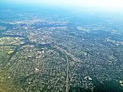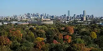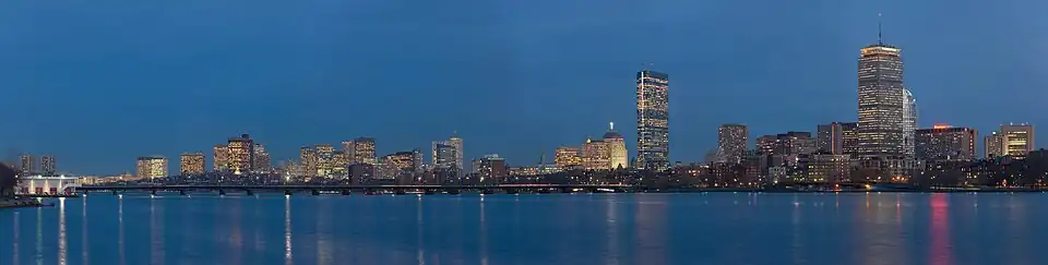 Vista de Boston a partir de Watertown Centro de Boston Biblioteca e Museu J.F.K. Museu de Belas Artes Capitólio Estadual de Massachusetts Panorama da cidade vista do Aeroporto Internacional de Logan. | |