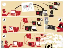 Os computadores podem ser cooptados para um botnet quando executam o software malicioso. Isso pode ser feito atraindo os usuários a fazer um drive-by download, explorando vulnerabilidades do navegador web, ou enganando o usuário a executar um programa cavalo de Tróia, que pode vir de um anexo de e-mail. Este malware tipicamente instala módulos que permitem que o computador possa ser comandado e controlado pelo operador da botnet. Muitos usuários de computador não sabem que o seu computador está infectado com bots. Dependendo da forma como está escrito, um cavalo de Tróia pode, então, apagar-se, ou pode permanecer presente para atualizar e manter os módulos. [Carece de fontes?]
