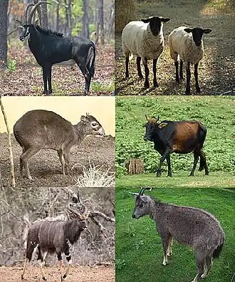 - Subfamília Alcelaphinae: vacas-do-mato, hirolas, gnus, topis (ou mezanzes ou cacus) e bonteboques