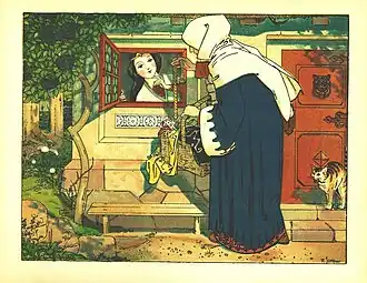 | A madrasta disfarçada oferece uma maçã a princesa. - Ilustração para "Snow White" por Carl Offterdinger, no final do Século XIX | |