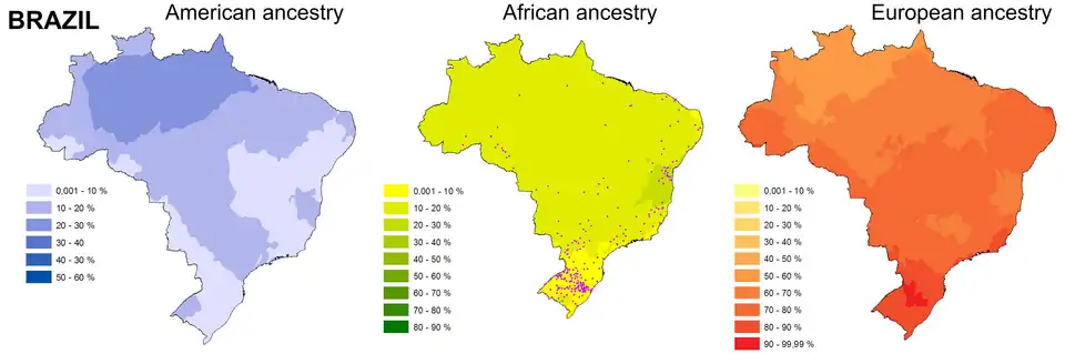 . PMID 24073242. doi:10.1371/journal.pone.0075145 - ↑ «Sistema IBGE de Recuperação Automática - SIDRA». Tabela 2094 - População residente por cor ou raça e religião. Instituto Brasileiro de Geografia e Estatística (IBGE). 2010. Consultado em 13 de janeiro de 2019