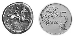 Uma original Biatec e sua réplica em um moderno 5 - coroa moeda.