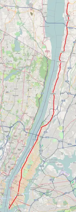 ![]() ![]() Broadway em destaque (vermelho) atravessando Manhattan, Bronx e parte do Condado de Westchester | |