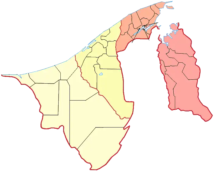 O Brunei consiste de duas partes sem ligação. Cerca de 97% da população vive na parte maior, a ocidente, enquanto que só 10 000 pessoas vivem na parte leste, montanhosa, que constitui o distrito de Temburong. As cidades principais são a capital, Bandar Seri Begawan (cerca de 46 000 habitantes), a cidade portuária de Muara e Seria.[9][57] Outras cidades importantes são a cidade portuária de Muara, a cidade produtora de petróleo da Seria e sua cidade vizinha, Kuala Belait.