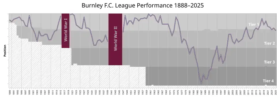 O Burnley foi um dos 12 fundadores da Football League, em 1888,[4] além de ser um dos cinco times que já conquistaram as quatro principais divisões profissionais do país, ao lado de Portsmouth, Wolverhampton Wanderers, Sheffield United e Preston North End.[5] Foi campeão inglês em duas oportunidades (temporadas 1920-21 e 1959-60), da FA Cup uma vez (1913-14) e da Supercopa da Inglaterra duas vezes (1960 e 1973). Entre seus grandes feitos consta, também, as quartas de final da Copa dos Campeões da Europa, atual UEFA Champions League, em 1960-61, quando foi eliminado pelo alemão Hamburgo.