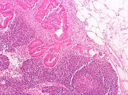 Adenocarcinoma é um tipo de tumor maligno epitelial, que se origina do epitélio glandular da mucosa colorretal. Tal tumor invade a parede, infiltrando a mucosa muscular, a submucosa, e daí, a muscularis propria. As células do tumor abrigam estruturas tubulares irregulares, de estrutura pluristratificada, lúmens múltiplos, e estromas reduzidos. Por vezes, as células do tumor secretam muco, que invade o fluido intersticial, produzindo grandes agrupamentos de muco e colóide (que, visualmente, aparecem como "espaços vazios") - é o chamado adenocarcinoma colóide, pouco diferenciado. Se o muco permanece dentro da célula do tumor, o muco empurra o núcleo celular para a periferia da célula - célula do tipo signet-ring. Dependendo da arquitetura glaudular, pleomorfismo celular, e padrão da secreção de muco, o adenocarcinoma pode ser categorizado em três graus de diferenciação: bem diferenciado, moderadamente diferenciado, e mal diferenciado.[48]