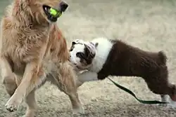 Para o bom relacionamento homem e canino existe um ato fundamental,(d) o adestramento, já que os cães são seres vivos que sentem, têm necessidades, possuem sentimentos e emoções, e este exercício constante lhes dá segurança e equilíbrio. Durante o processo, o dono dita, o cão obedece e acostuma-se com bons atos. Um canino que nunca aprendeu a sentar ou ficar, pode fugir ou correr na direção do perigo. Para um adestramento ser bem-sucedido, o homem precisa entender o potencial e as limitações do animal e ensiná-lo o respeito através das atividades. Em geral, todos os cães são capazes de aprenderem os comandos básicos para manterem um bom equilíbrio na relação, mais especificamente quando feitos por meio das brincadeiras, já que tanto o homem quanto o canino são animais neotênicos. É através das atividades que ele aprende, se socializa, desenvolve-se, se exercita e supre suas necessidades de gasto energético. Em suma, no relacionamento homem e animal, é o adestramento que dá uma boa base, norteia uma relação equilibrada destas espécies tão distintas, direciona e mostra as maiores habilidades de dadas raças.[61] Em contrapartida, é primordial saber adestrar um cão, com as palavras certas e os métodos corretos — cujas linhas ainda não estão totalmente traçadas pelos profissionais — a fim de evitar traumas e inseguranças.[63]