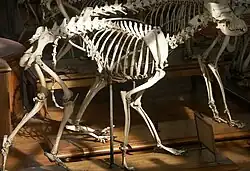 Assim como em todos os mamíferos, as funções de sustentação, proteção e locomoção são executadas pelos esqueletos ósseo e muscular. Igualmente aos seres humanos, os cães possuem estrutura básica, cujos níveis encontram-se nas alturas escapular e pélvica, uma para os membros superiores e outra para os membros inferiores. A diferença encontra-se no fato das duas alturas servirem para a locomoção canina, ao passo que só a inferior é utilizada na locomoção humana. Para andar, os caninos dependem dos graus articulares, mas principalmente do sistema neuro-muscular, que exerce as suas funções de contração e relaxamento, graças a ligação ao sistema nervoso e as superfícies articulares do esqueleto ósseo.[54] Suas patas, fundamentais na locomoção, têm nos coxins a única parte da pele com glândulas sudoríparas, o que ajuda a mantê-las flexíveis. São ainda pouco sensíveis ao frio e ao calor, o que lhes ajuda quando em situações mais rigorosas,[39] bem como possuem entre quatro e cinco dedos, o que proporciona sensibilidade, adaptação e aderência muito boas. Em comparação ao cavalo, outro forte animal domesticado, o cão é ainda um melhor saltador, devido a sua musculatura, e possui uma coluna mais flexível.[55]