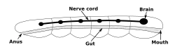 Estrutura corporal genérica de um animal bilatério. O sistema nervoso é formado por um cordão neural com alargamentos segmentais, e um "cérebro" na frente.