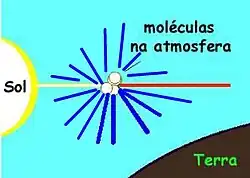 Algumas partículas e moléculas da atmosfera (algumas resultando de poluição atmosférica) têm a capacidade de difundir a radiação solar em todas as direcções. Certas partículas são mais efectivas a difundir luz com um determinado comprimento de onda de luz (é a difusão selectiva - difusão de Rayleigh). É o caso das moléculas do ar, como o oxigénio e o azoto, que são de pequena dimensão e por isso difundem com mais eficiência luz com comprimentos de onda curtos (azul e violeta).