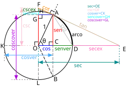 Ao trabalhar com triângulos retângulos, seno, cosseno e outras funções trigonométricas só fazem sentido para medidas de ângulo maiores que zero e menores que π/2. Entretanto, quando definidas com o círculo unitário, essas funções produzem valores significativos para qualquer medida de ângulo de valor real – mesmo aquelas maiores que 2π. Na verdade, todas as seis funções trigonométricas padrão – seno, cosseno, tangente, cotangente, secante e cossecante, bem como funções arcaicas como seno verso (verseno) e secante externa (exsecante) – podem ser definidas geometricamente em termos de um círculo unitário, como mostrado à direita.