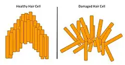 Célula Ciliada Externa Normal/ Lesionada - Indivíduos com perda auditiva sensorioneural podem apresentar diferentes tipos de falhas cocleares, decorrentes de lesão nas células ciliadas externas (CCE) e/ou nas células ciliadas internas (CCI), sendo que o tipo de lesão tem influência nas respostas do indivíduo frente aos estímulos sonoros.[9] As células ciliadas são sensíveis a diferentes formas de dano patológico, incluíndo trauma acústico, medicamentos ototóxicos, anomalias congênitas e o envelhecimento (presbiacusia).[10]
