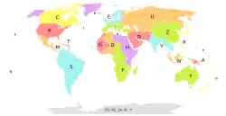 Mapa das regiões ICAO pela primeira letra do código.