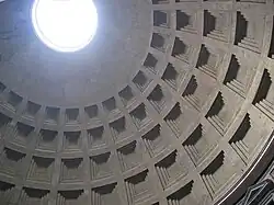 A cúpula do panteão é semiesférica, formada de concreto com escombros de tufo e escória vulcânica. As partes externas da cúpula foram forradas com opera latericia. Também foram utilizados ladrilhos de dois pés em camadas horizontais, por meio de anéis.[3] Os tijolos romanos de dois pés (aproximadamente 60x60x7cm) eram duas vezes maiores do que os comuns, com o objetivo de manter seu centro de gravidade mais distante da borda, o que permitia fazer desvios mais pronunciados do que os permitidos com tijolos comuns, o que os tornavam especialmente aptos para a construção de cúpulas sem formas e permitia completar um setor de arco maior da cúpula trabalhando somente com cursos horizontais, muito mais simples do que os cursos radiais.[4] Foi a maior cúpula construída em sua época, com seus 43,44 m de diâmetro, coroada por um amplo óculo de 8,9 m que permite a entrada da luz no espaço interno. A estabilidade estrutural foi obtida com o uso de concreto, forrado em opera latericia, paredes de tijolos com argamassa de cimento, características da arquitetura romana, e diversas técnicas de redução do peso próprio, seja por diminuição progressiva da espessura da cúpula (de 5,9 m na base até menos de 1,4 m em sua coroa) ou pela substituição do travertino por pedra-pomes na área superior.
