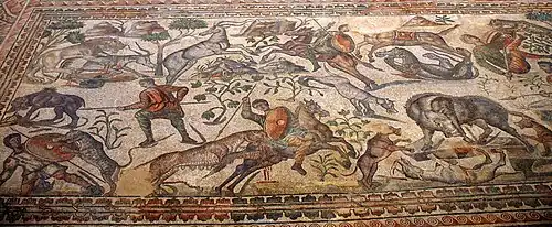 Mosaico ilustrativo de caça grossa, na vila romana de Olmeda, em Saldanha, Palência.