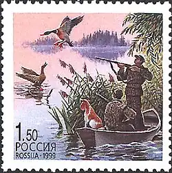 Selo russo de 1999 ilustrando a caça ao pato