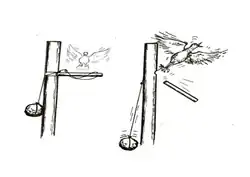 Os Ojibwa do Canadá faziam uma engenhosa armadilha para caçar pássaros. Afixavam no solo um tronco fino de árvore, com um furo transversal na parte superior. Por este furo passavam um cordão em cuja extremidade inferior estava amarrada uma pedra. No buraco do tronco era colocada a ponta de uma vareta mais fina do que ele e um era dado no cordão de modo que a pressão do nó sobre a vareta mantinha a pedra no ar e a vareta na posição horizontal. Na parte superior do cordão, descansando sobre a vareta, era feito um laço corrediço. Quando o pássaro pousava na vareta quebrava o equilíbrio fazendo com que a vareta se deslocasse e o nó passasse pelo orifício, puxado pela pedra. O laço se fechava e prendia a ave.[42]