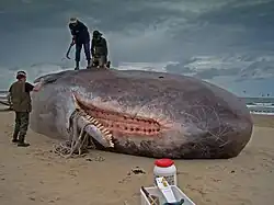 Gravura de 1577 representando cachalotes encalhados. O desenho é bastante grosseiro. Note-se que o autor representou (por engano) duas narinas (ou respiradouros) na extremidade do melão de cada animal, olhos bem colocados e barbatanas dorsais mais salientes que as naturais.